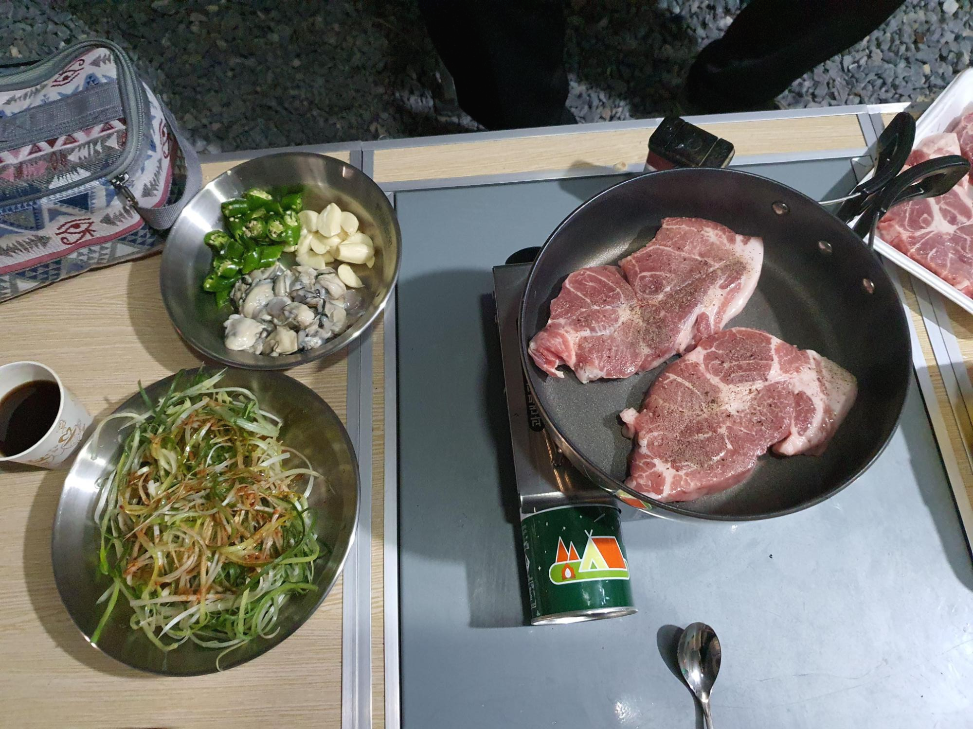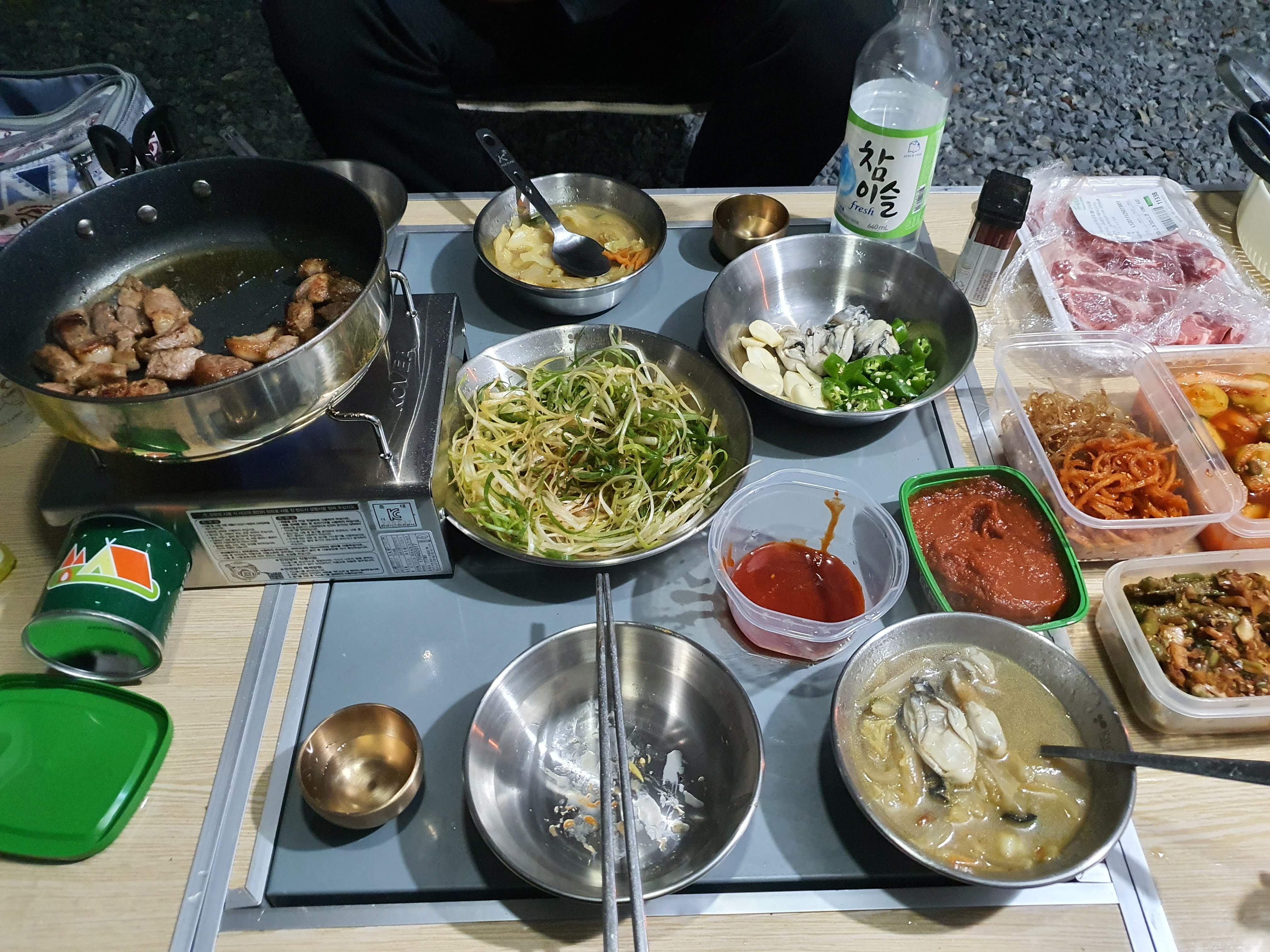 다시 캠핑장 가서 챙겨간 생굴에 목살 꾸워서 소주 먹을 준비.